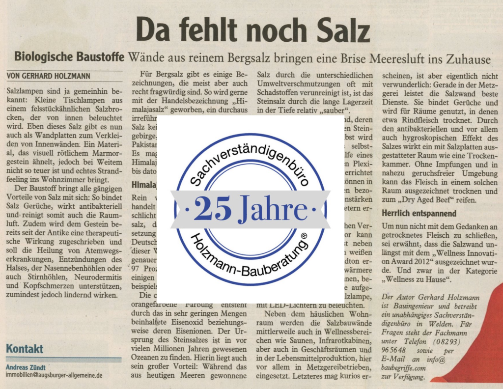 Salz ist nicht nur für die Spiegeleier, sondern kann vielseitig beispielhaft auch für etwaige Therapien genutzt werden. Zu Salzgrotten ausgebaute Räume waren und sind ein Hype im Wellnessbereich. Aber auch das bekannte Dry Aged Beef ist sowas Ähnliches wie Wellness, nur mehr so für den Gaumen. Der Bausachverständige Gerhard Holzmann aus Augsburg hat im Jahr 2013 genauer hingesehen und Natriumchlorid auch als Mauersteine geprüft. Dabei kam auch auf, dass das so gerne gekaufte Himalaya Salz gar nicht aus dem Himalaya Gebirge stammt, sondern vielmehr aus Pakistan und zwar gute 300 km südwestlich des Himalaya.