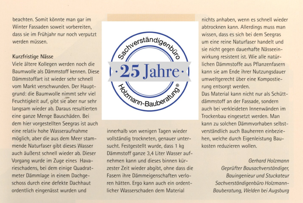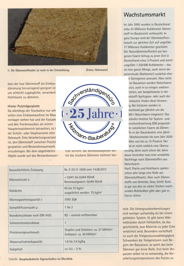 Hier wäre als erstes die Flachsdämmung zu sehen, zu welcher wir, mit der Firma Flachshaus einen Hersteller in Norddeutschland haben. Hier wird der zur Faser aufbereitete Flachs mit pflanzlicher Stärke zu einem stabilen Dämmvlies verarbeitet, das neben Anderem sehr gerne zur Dämmung von Installationsebenen im Hausbau genutzt wird, vor allem im Holzhausbau. Eine detaillierte Beschreibung hierzu und natürlich auch zum Flachs selbst finden Sie im Sachbuch „Natürliche und pflanzliche Baustoffe“ (http://www.springer-vieweg.de/Buch/978-3-8348-1321-3/Natuerliche-und-pflanzliche-Baustoffe.html).