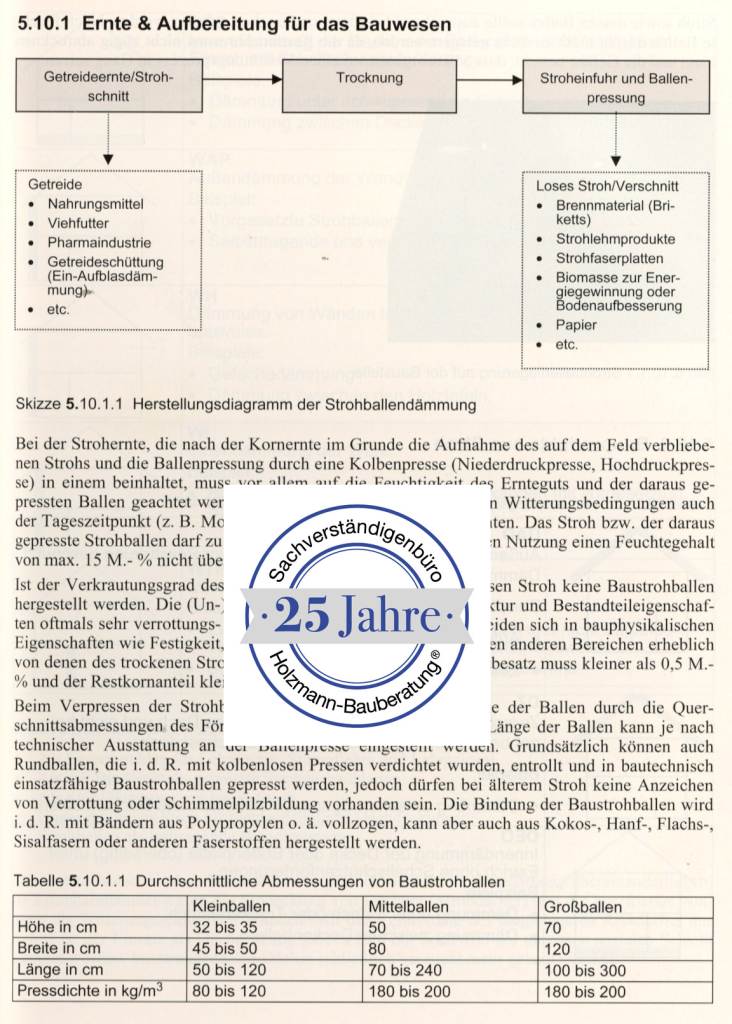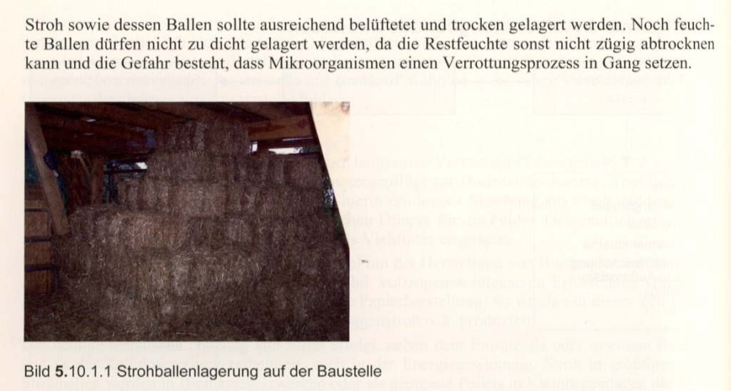 Augsburg: „…Aber sehen wir uns nun einmal das Strohballenhaus im Detail an. Stroh besteht im Wesentlichen aus Zellulose, Kieselerde und Lignin. Die Halme an sich weisen eine wachsartige, wasserabweisende Außenschicht auf, welche sie nahezu unempfindlich gegen viele schädliche Einflüsse von außen macht. Trotz dieser Schutzschicht auf den Halmen ist es jedoch zwingend erforderlich, bei Wandaufbauten aus Strohballen einen diffusionsoffenen und einen zumindest konstruktiven Schlagregenschutz zu erbauen. Durch eine rohrförmige Struktur wird eine hohe Elastizität und Reißfestigkeit erreicht und die in den abgeschlossenen Hohlräumen des Halmes eingeschlossene Luft bewirkt zudem ein hohes Wärmedämmvermögen.